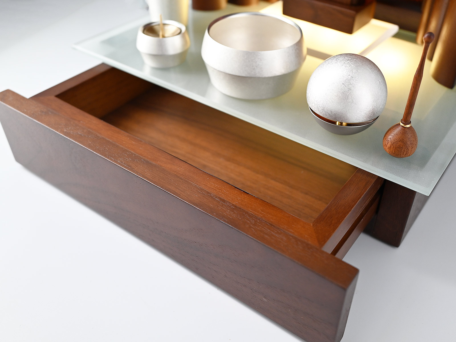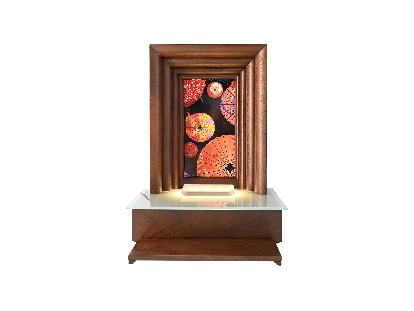 手元供養ステージ Soraの家/ふうは、女性デザイナーによる洗練されたデザインとコスパが魅力の手元供養ステージです。背板の写真は付属の4種類から着せ替えができます。便利な引き出しや、供物台も付いています。ステージ上部はガラス製で、本尊台は可動取外しできます。