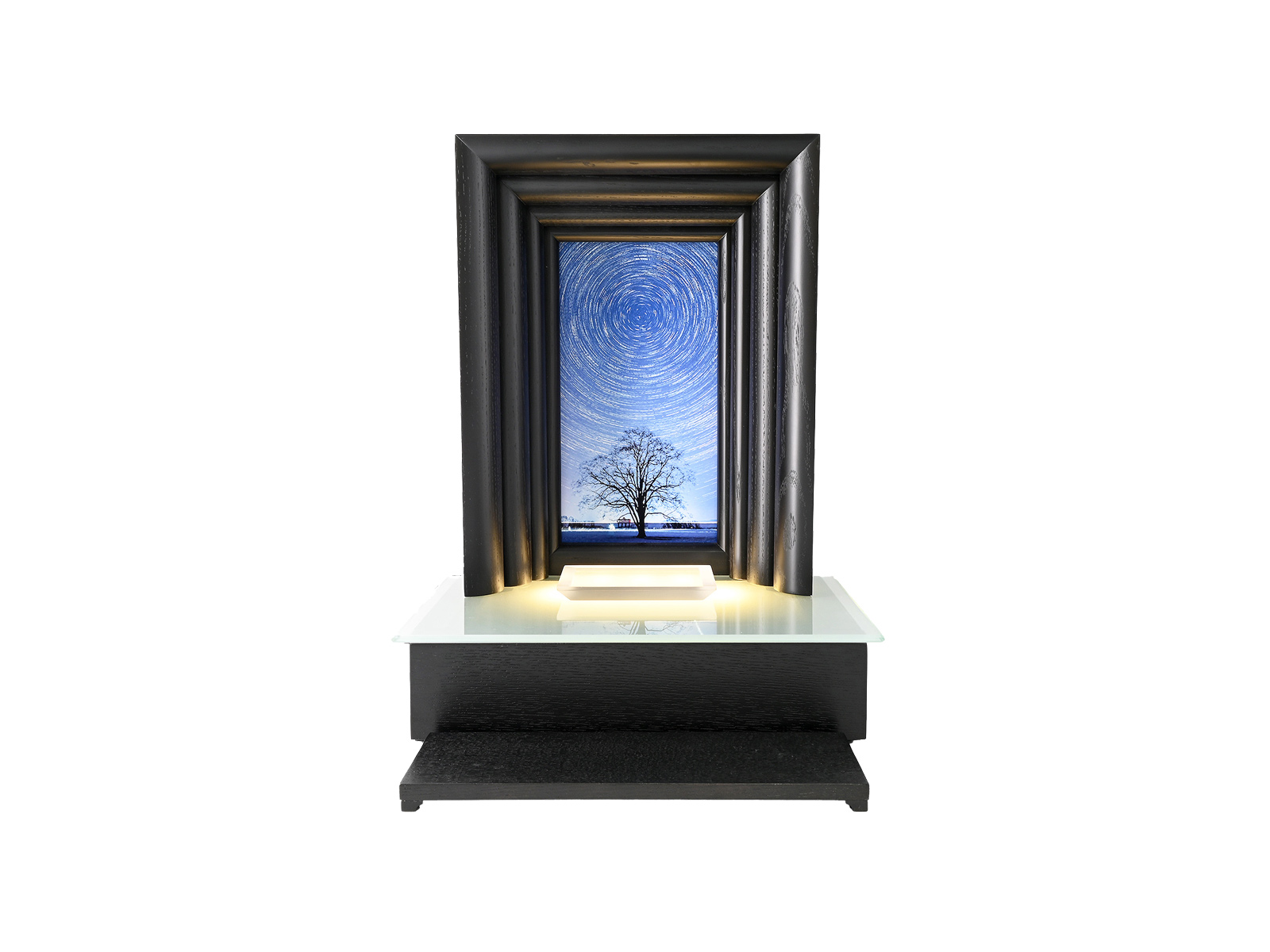 手元供養ステージ Soraの家/ふうは、女性デザイナーによる洗練されたデザインとコスパが魅力の手元供養ステージです。背板の写真は付属の4種類から着せ替えができます。便利な引き出しや、供物台も付いています。ステージ上部はガラス製で、本尊台は可動取外しできます。