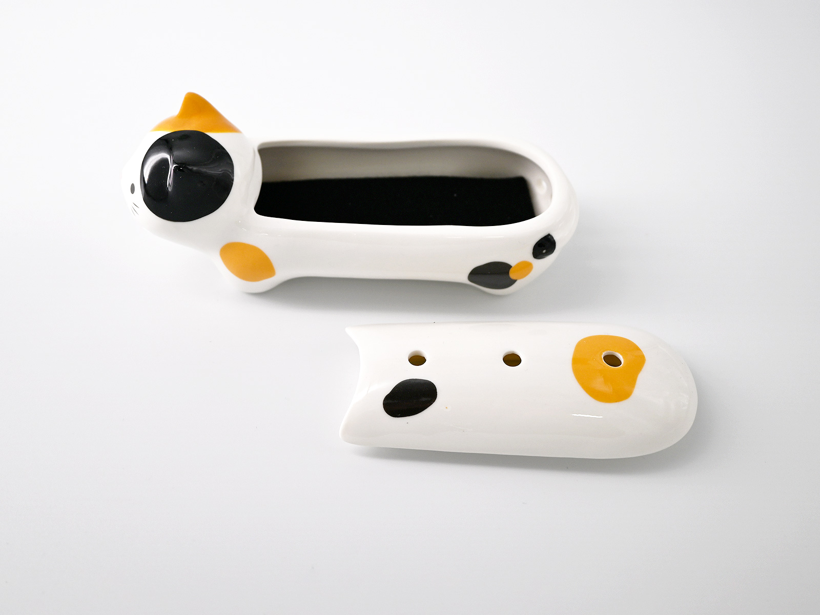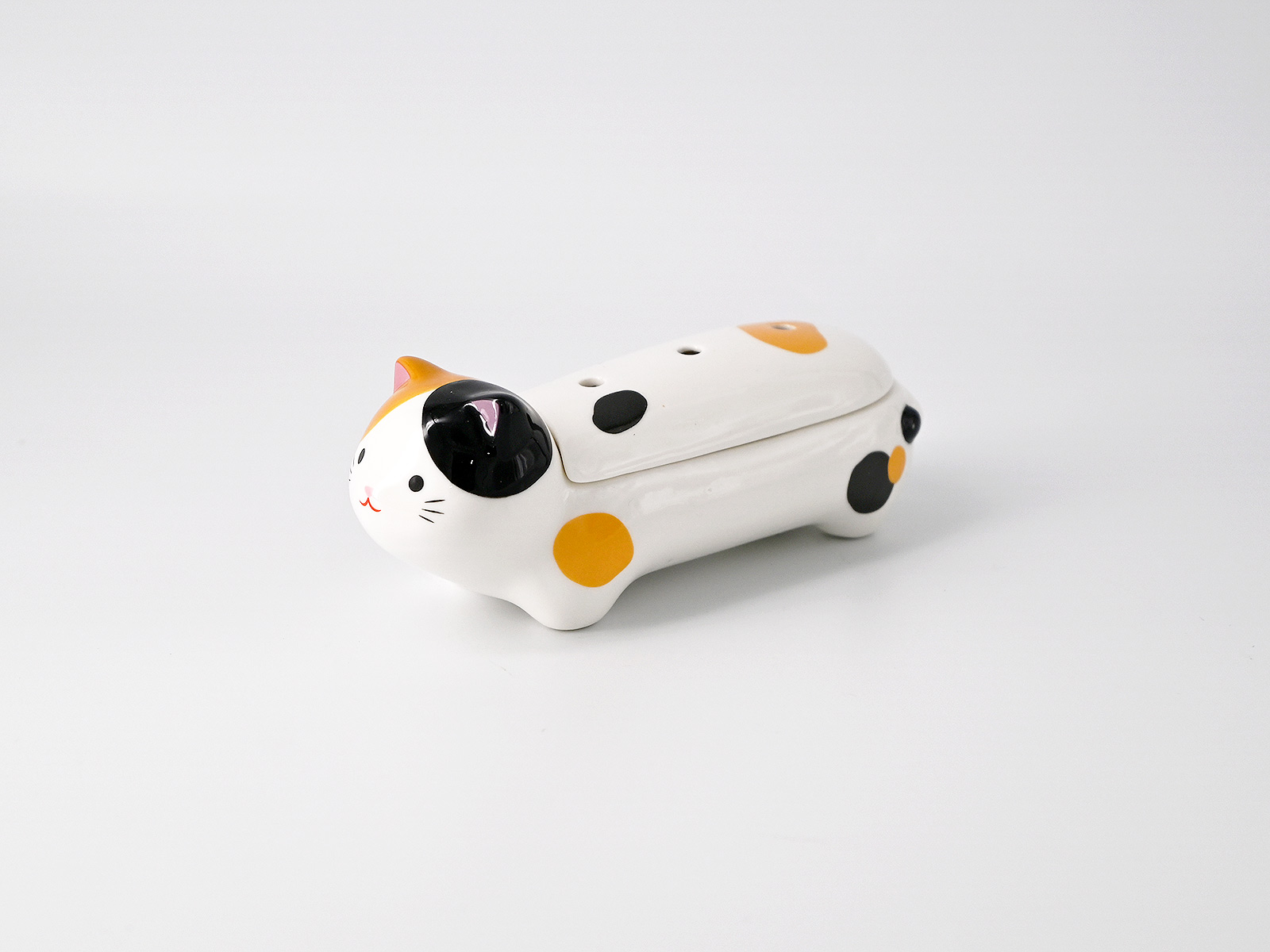トコトコと歩いているようなフォルムの猫型寝かせる線香皿です。リビングや玄関、お仏壇・手元供養ステージなど様々な場所や用途で癒してくれます。